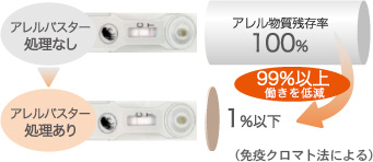 アレルバスター処理によって、ダニアレル物質の働きを99%以上低減することが免疫クロマト法によって実証されました。