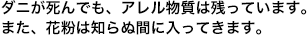 たとえダニが死んでも、そのフンや死がいを除去しなければアレル物質は残り、飛散して人体に影響を及ぼします。また花粉は衣服に付着するため、完全には室内からシャットアウトできません。室内でアレル物質の働きを低減させる対策は、非常に重要なのです。