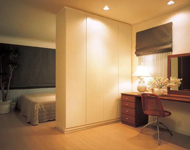 壁などの工事をせずに収納を移動させるだけで、2つの個室にすることも。広さも自由自在に調整できます。