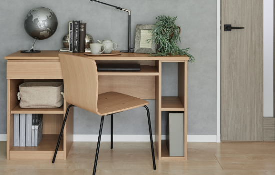 リビングダイニングに置いても主張しすぎないシンプルなデザインのデスク。幅サイズは83㎝・106㎝・128㎝の3タイプで、カラーは内装色に合う5色からお選びいただけます。さらにデスクに合わせたワゴンも2タイプご用意しています。