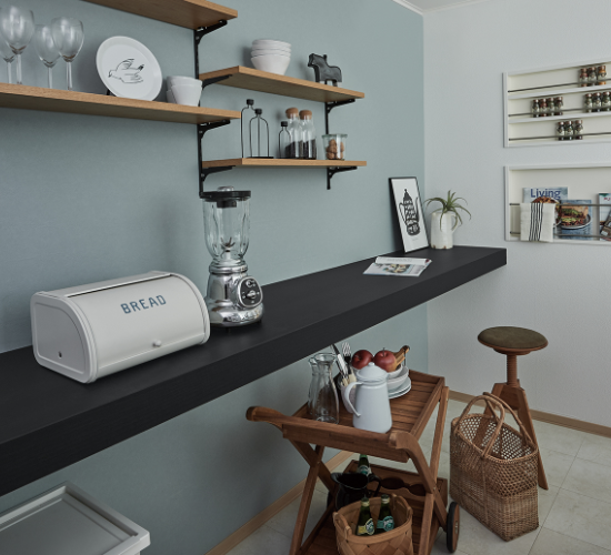 インテリアを美しく際立たせる、シンプルで上質な一枚板のようなシルエット。カウンター内部に受桟を納め、ハニカム構造の特殊強化芯材を採用。受桟や取付金具類が見えない美しい仕上がりで、間口の広い棚を設えることができます。