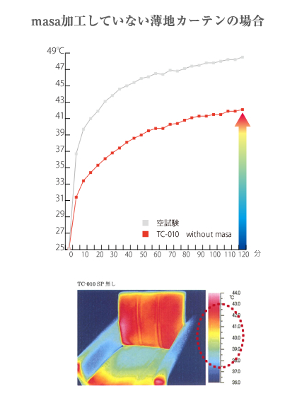 素材の特性(風合い、物性、通気性)を変えることなく優れた機能をプラスできるmasa加工技術は、赤外線吸収効果により、夏の太陽光による室温上昇を2℃抑え、エアコンの効率も高まり、節電やエコに役立ちます。